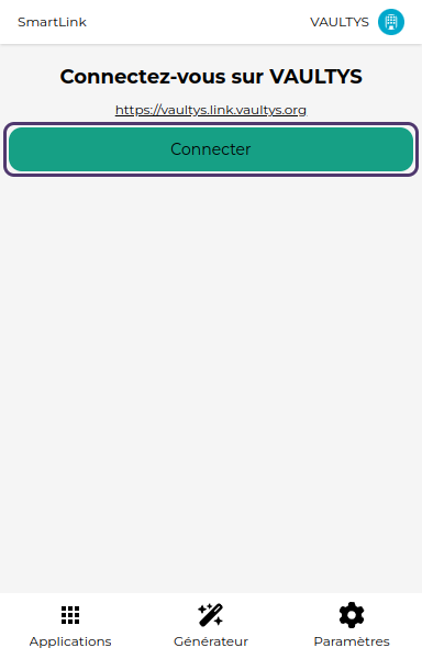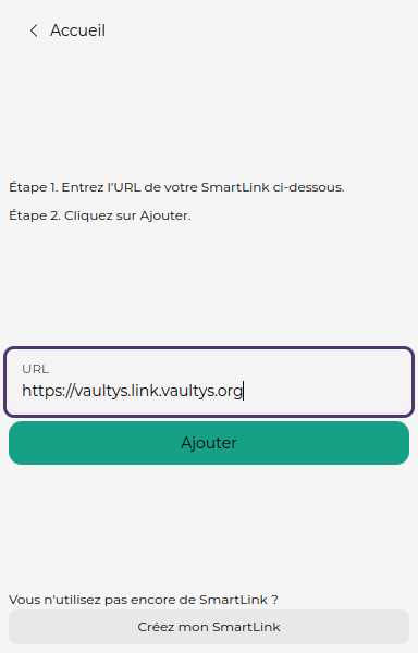 Vous arrivez sur l'écran d'ajout d'un SmartLink. Entrez l'URL de votre SmartLink (ex: https://mon-smartlink.link.vaultys.org) dans le champ correspondant.