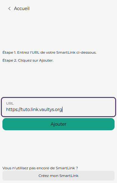 Vous arrivez sur l'écran d'ajout d'un SmartLink. Entrez l'URL de votre SmartLink (ex: https://mon-smartlink.link.vaultys.org) dans le champ correspondant.