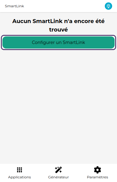 Au premier lancement, aucun SmartLink ne sera configuré. Vous arrivez donc sur une page qui vous l'indique, cliquez sur le bouton "Configurer un SmartLink" pour continuer.