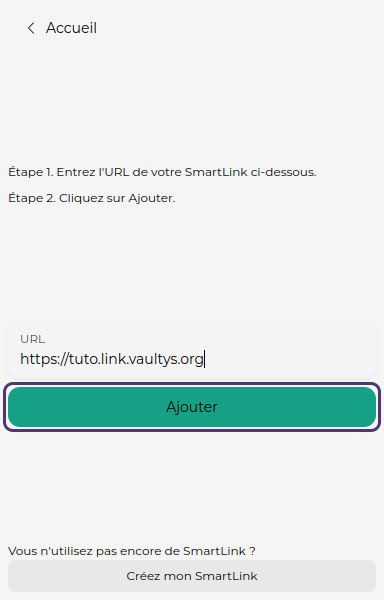 Vous arrivez sur l'écran d'ajout d'un SmartLink. Entrez l'URL de votre SmartLink (ex: https://mon-smartlink.link.vaultys.org) dans le champ correspondant.
