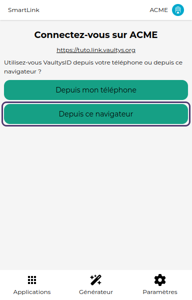 Dans la majorité des cas, vous avez installé l'application VaultysID sur votre Smartphone. Dans ce cas cliquez sur le premier bouton. Vous devrez ensuite scanner un QR code avec VaultysID, comment pour vous connecter sur SmartLink en version web (étape 2).