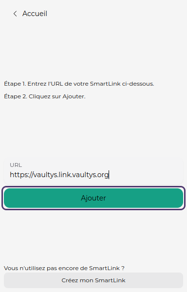 Vous arrivez sur l'écran d'ajout d'un SmartLink. Entrez l'URL de votre SmartLink (ex: https://mon-smartlink.link.vaultys.org) dans le champ correspondant.