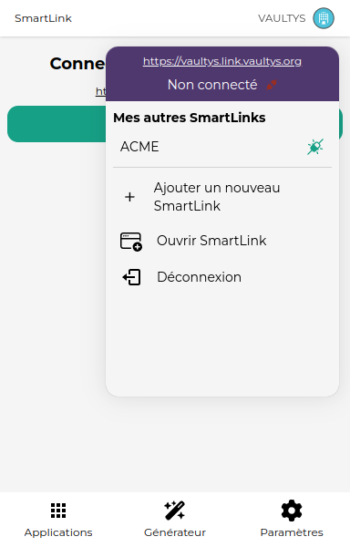 En ouvrant le menu, vous retrouvez la liste de vos SmartLinks. Cliquez sur l'un deux pour changer de SmartLink courant.