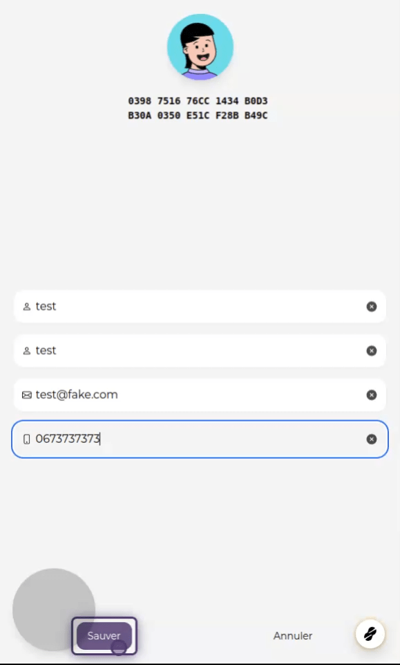 Une fois la procédure terminée, vous pouvez remplir les coordonnées de votre contact (nom, prénom, mail, téléphone), puis cliquez sur Sauver